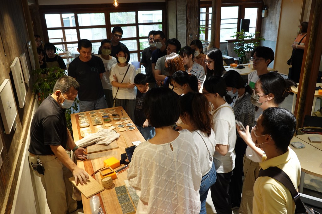 由小轉角整建修復時的泥作司阜 - 蔡啟豐,講授抿石子工法的簡單流程,並選個顏色的小石子配比,讓大家體驗並製作居家使用的抿石子杯墊。