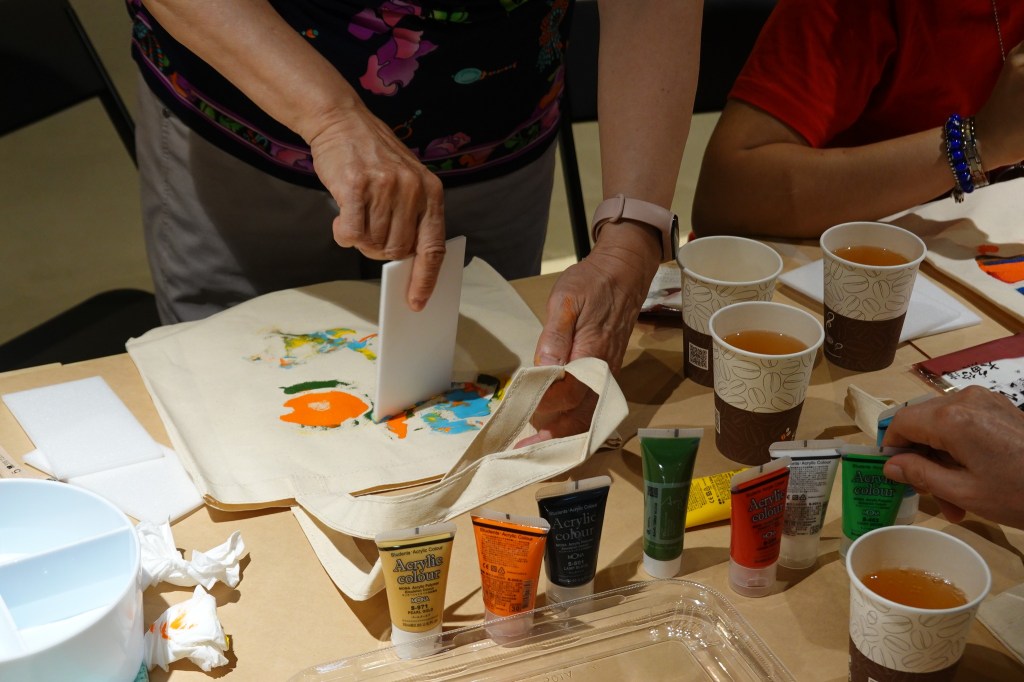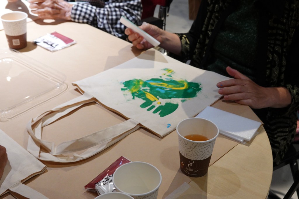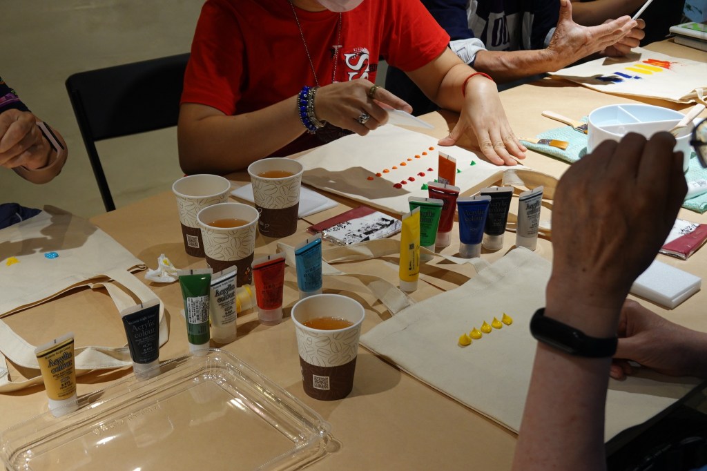 今天的藝術創作工坊在前頭聽完這些歷史生活故事後,透過這個老房子承載的記憶回應到今天的帆布袋創作,用顏料在帆布袋上留下痕跡,有拖曳的停留、有筆刷的點綴、有像歷史紋路一樣層層疊加的呈現;紅紅綠綠的像是在小轉角的樹葉與花,也有像人生雨過天青看見彩虹、金光閃閃的像編竹一樣的交織…,也在帆布袋的背後選一個屬於小轉角的質感圖樣,絹印在上面。