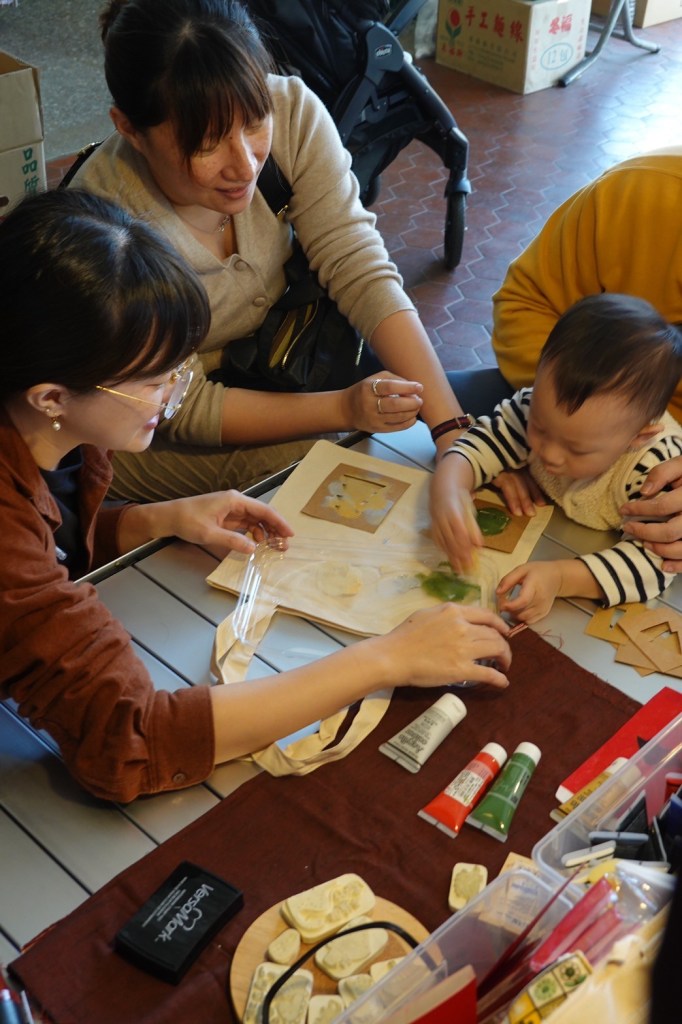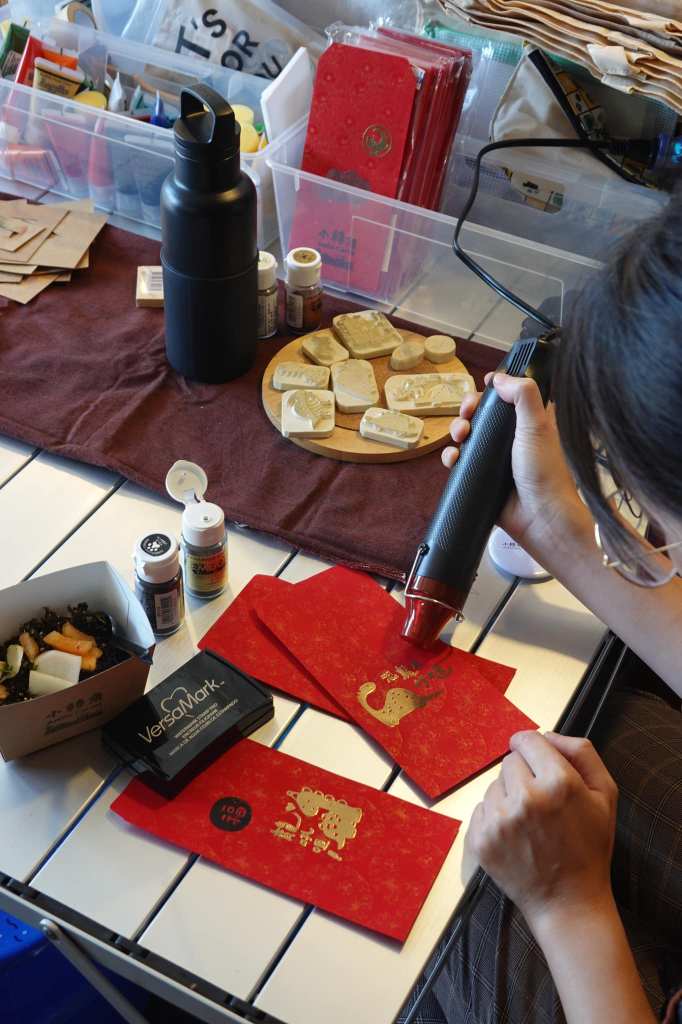 和團隊同事一同企劃的手感體驗的內容是這次市集的主要任務。其實本來是設計了另外一套蓋印帆布袋的採集體驗,在前一晚忽然靈光一閃來替迎接喜氣一點的龍年準備金光閃閃的採集吧!連夜靈感爆發得刻了一系列恐龍年的手作印章,能夠讓來玩的大朋友小朋友簡單製作燙金立體的紅包袋,整個下午座無虛席的體驗攤大大成功!